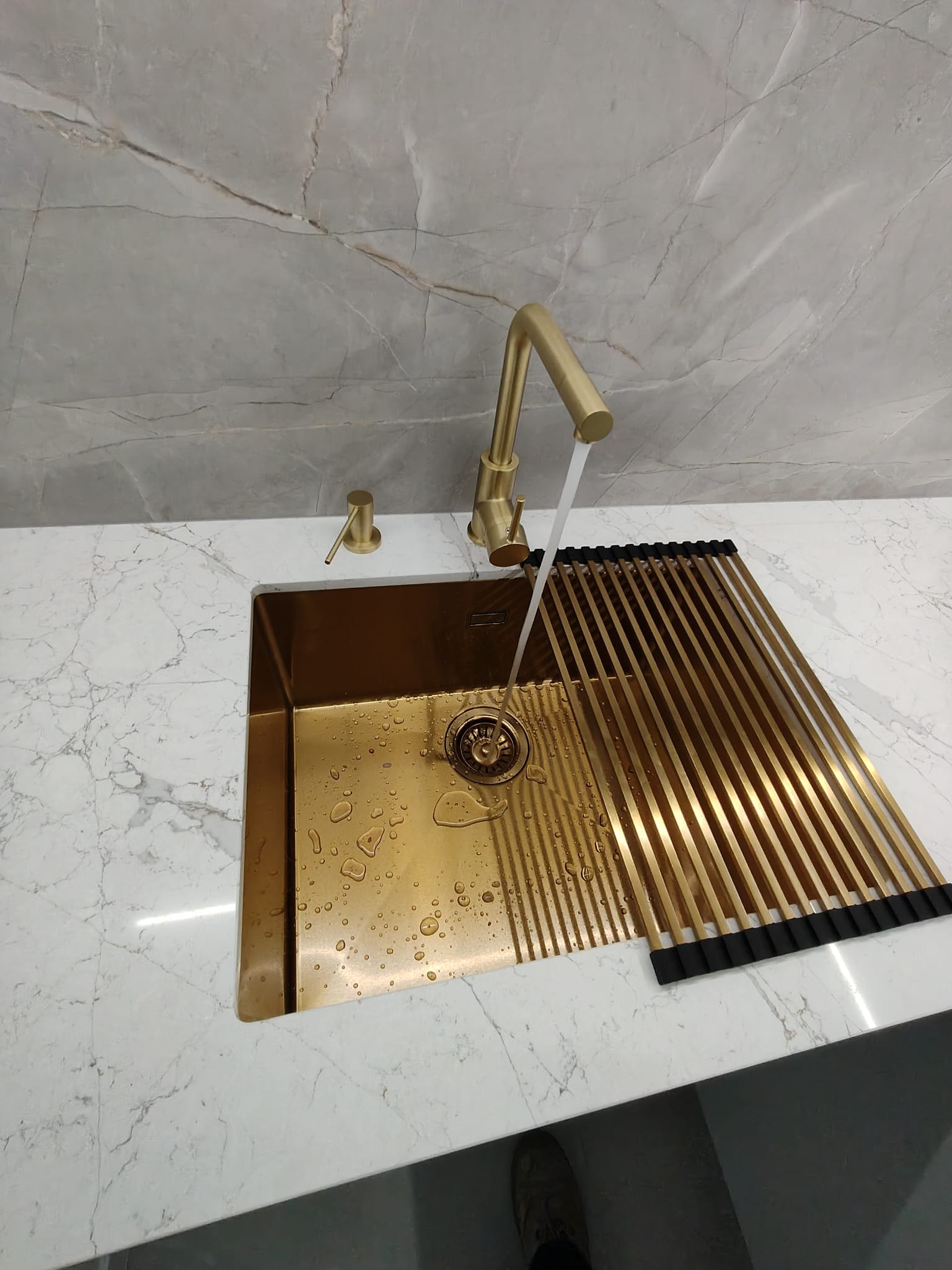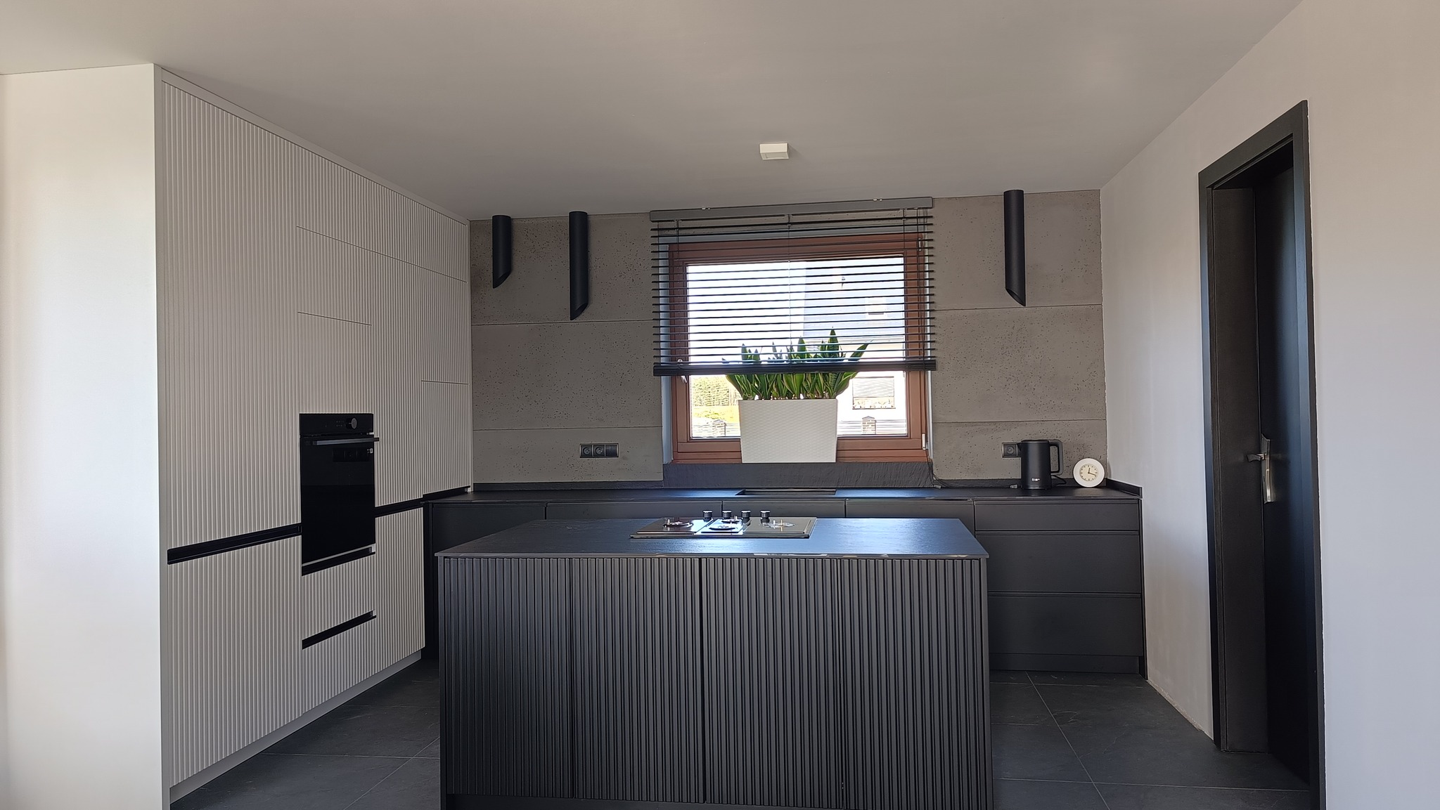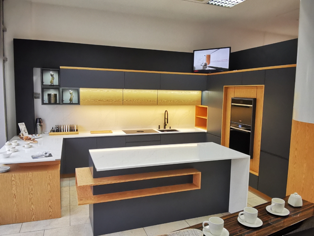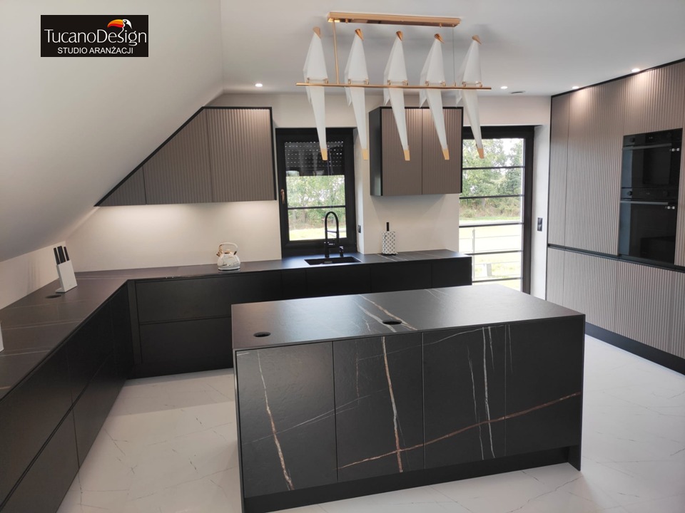 Meble kuchenne w kolorze Ciepłej Magnolii W tej kuchni pierwsze skrzypce grają fronty wykonane w kolorze ciepłej Magnolii a zestawienie jej ze złotymi listwowymi uchwytami wprowadza do wnętrza przytulny ciepły nastrój. Wysoka w rogu witryna wykona ze szkła Antisol czarny to maksimum elegancji, całość uzupełniają czarne sprzęty AGD. Blat w tej kuchni wykonany z konglomeratu kwarcowego w kolorze Calacatta Silva to trwałość i piękno na lata. Szafki o wysokości dopasowanej do wzrostu domowników gwarantują wygodę podczas gotowania. Jeżeli potrzebujesz pełną ciepła, praktyczną i piękną kuchnię to ta propozycja jest dopasowana do Ciebie.