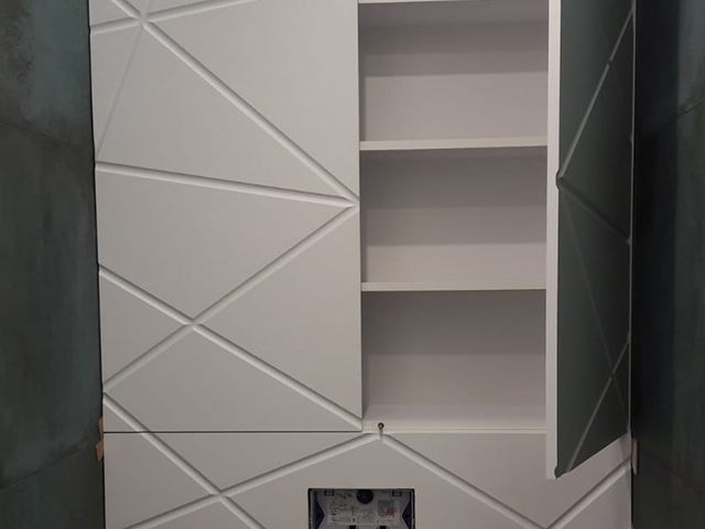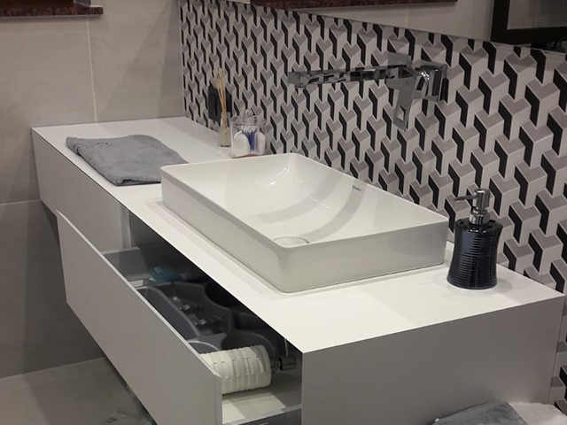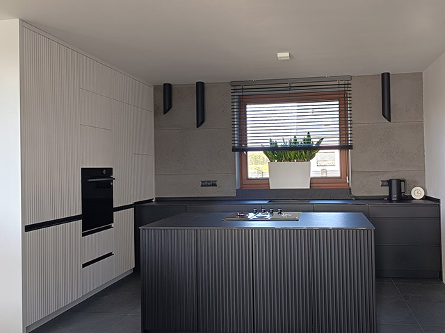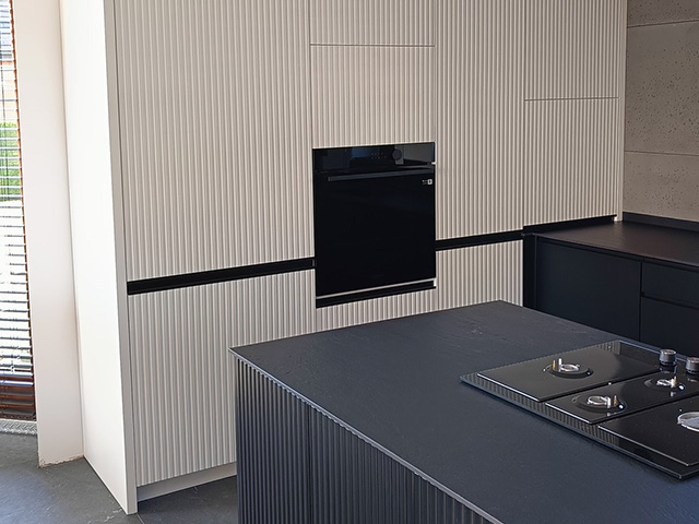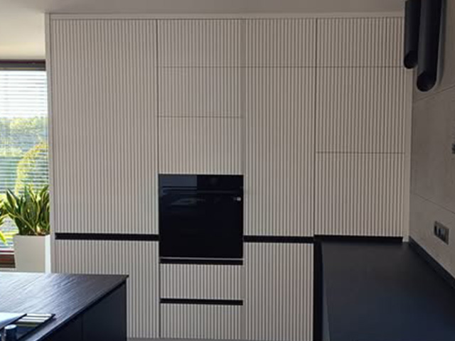Meble kuchenne w kolorze Ciepłej Magnolii W tej kuchni pierwsze skrzypce grają fronty wykonane w kolorze ciepłej Magnolii a zestawienie jej ze złotymi listwowymi uchwytami wprowadza do wnętrza przytulny ciepły nastrój. Wysoka w rogu witryna wykona ze szkła Antisol czarny to maksimum elegancji, całość uzupełniają czarne sprzęty AGD. Blat w tej kuchni wykonany z konglomeratu kwarcowego w kolorze Calacatta Silva to trwałość i piękno na lata. Szafki o wysokości dopasowanej do wzrostu domowników gwarantują wygodę podczas gotowania. Jeżeli potrzebujesz pełną ciepła, praktyczną i piękną kuchnię to ta propozycja jest dopasowana do Ciebie.